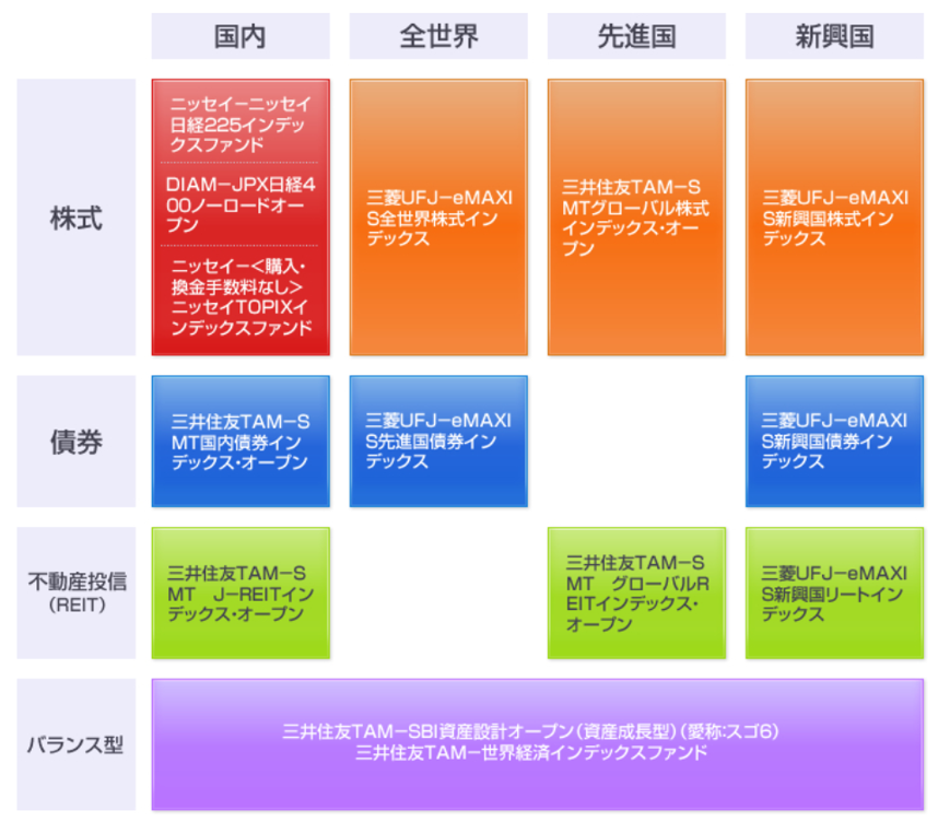 SBI証券のインデックスファンドに関するページでは、次のような分類がされています。