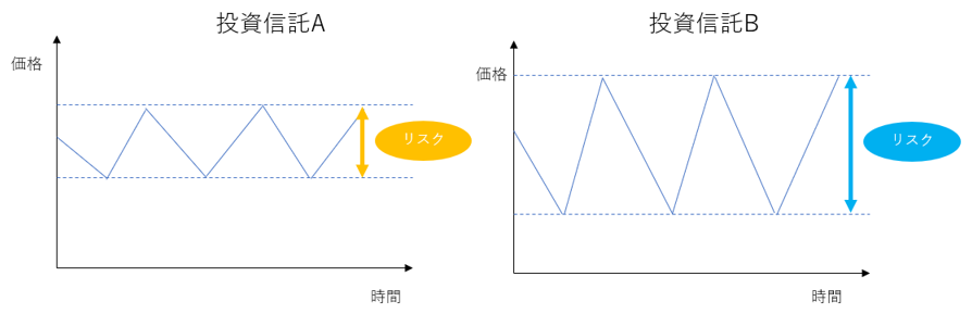投資信託Aと投資信託Bの価格変動を表しています。投資信託Aよりも投資信託Bの方が価格の変動幅が大きくなっています。この場合、有価証券Bの方が「リスクが高い」と判断します。