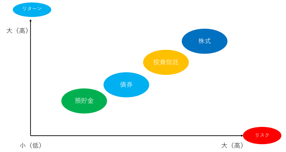 預貯金が最もローリスク・ローリターン。株式が最もハイリスク・ハイリターンになります。